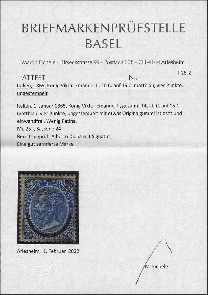 | Zusatzinformationen und Suchstichworte: | Götz 402. Auktion 19. - 23. Juni 2023 Los 2562 Italien 20 a. 15 C, blau mit Aufdrucktype II, ungebraucht mit Originalgummi u. etwas Alterspatina. Diese Type ist ausserordentlich selten! Geprüft A. Diena sowie Farbfotoattest Eichele. Mi. 5.000,- € Ausruf 600,00 EUR |