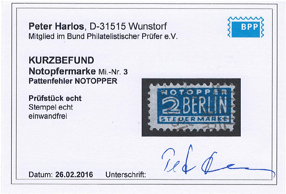 | Zusatzinformationen und Suchstichworte: | Notopfer Nr. 3 mit Plattenfehler "Notopper" |