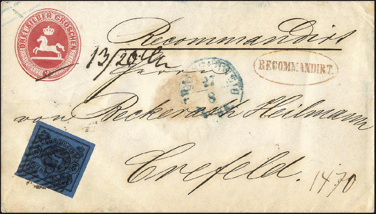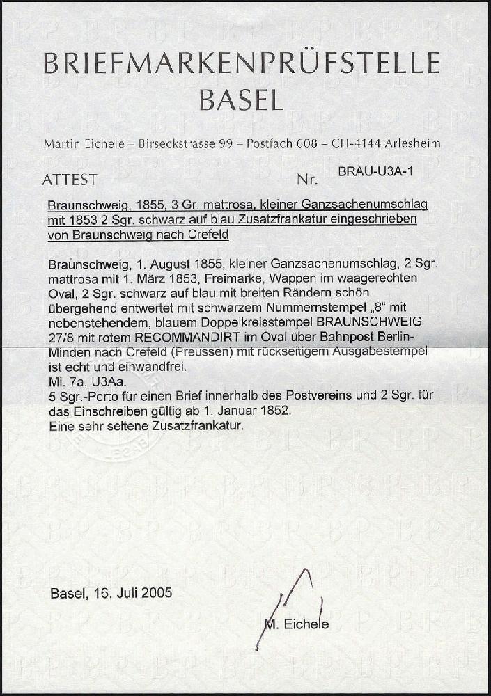 | Zusatzinformationen und Suchstichworte: | Götz 402. Auktion 19. - 23. Juni 2023 Los 3185 Altdeutschland Braunschweig 2 Sgr. schwarz/blau sehr breit gerandet als Zusatzfrankatur auf GA 3 Sgr. (U3Aa), tadellose Erhaltung von Braunschweig nach Crefeld gelaufen. Selten! Farbfotoattest Eichele Ausruf 600,00 EUR |