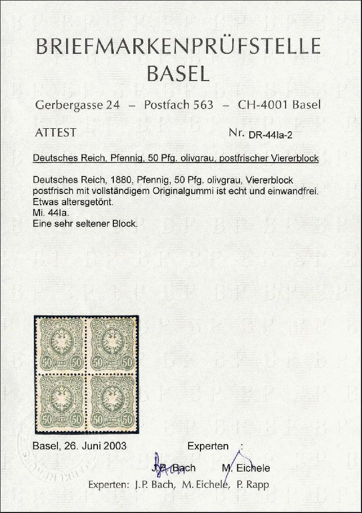 | Zusatzinformationen und Suchstichworte: | Götz 402. Auktion 19. - 23. Juni 2023 Los 3311 Deutsches Reich, 1880/89 Pfennig 50 Pfg. olivgrau, seltener 4er-Block ungebraucht bzw. unteres Paar ** u. trotz Alterspatina eine wenig angebotene Marke. Farbfotoattest Eichele. Mi. 5.560,- € für Einzelmarke Ausruf 500,00 EUR |