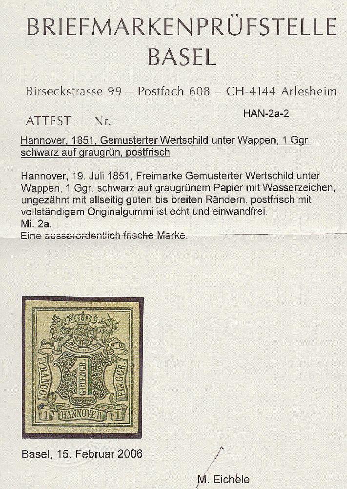 | Zusatzinformationen und Suchstichworte: | 17. classicphil GmbH Auktion 31. Mai - 2. Juni 2023 Los 2162 Altdeutschland Hannover 1851, 1 Ggr, schwarz auf graugrün, ungezähnt, postfrisch, mit Wz, gute bis breite Ränder, originaler Gummi, Gummi etwas getönt, Attest Eichele, Prachtstück! Schätzpreis 200€ Zuschlag 360,00 EUR |