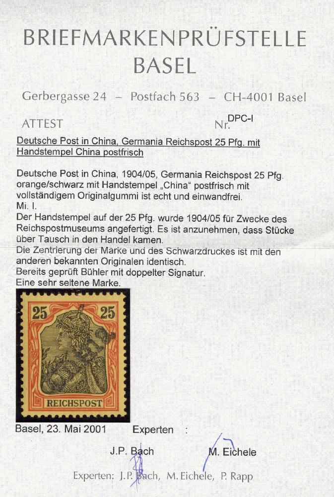 | Zusatzinformationen und Suchstichworte: | Cherrystone - Weltweite Briefmarken & Postgeschichte 9. - 10. Mai 2023 Los 463 Deutsche Auslandspost China 1904-05 unissued 25pf red orange & yellow black, handstamped "China", n.h., v.f., double signed Buhler, with 2001 Eichele certificate ("Eine sehr seltene marke"). Michel catalogue states that the handstamp for 25pf was prepared as a Specimen for the Reich Post Office (catalogued as hinged) (Catalog value €50,000) Zuschlag 23.000,00 EUR |