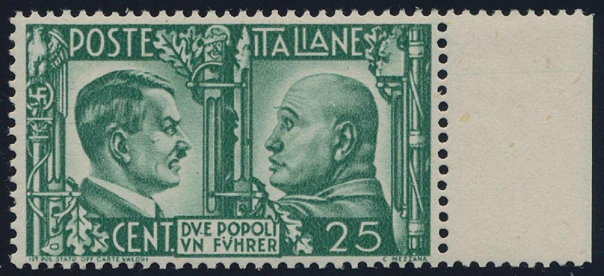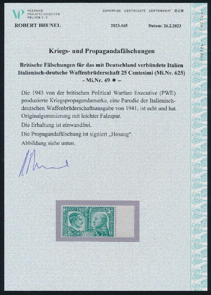 | Zusatzinformationen und Suchstichworte: | HBA 81. Auktion 11. - 13. Mai 2023 Los 1462 (D) Kriegs und Propagandafälschungen II. WK 1943, Britische Fälschung für das mit Deutschland verbündete Italien, Propagandafälschung der Marke Italien MiNr. 625 mit Abbildung "Hitler grimmig und Mussolini entsetzt" und Inschrift "DUE POPULI/UN FÜHRER", sehr sauber ungebrauchtes Kabinettstück mit minimaler Falzhaftspur, vom rechten Bogenrand, ungefaltet, sehr seltene Marke, sign. Hosang und gepr. Brunel mit neuem Fotoattest, Mi. 1500,-- Zuschlag 480,00 EUR |
