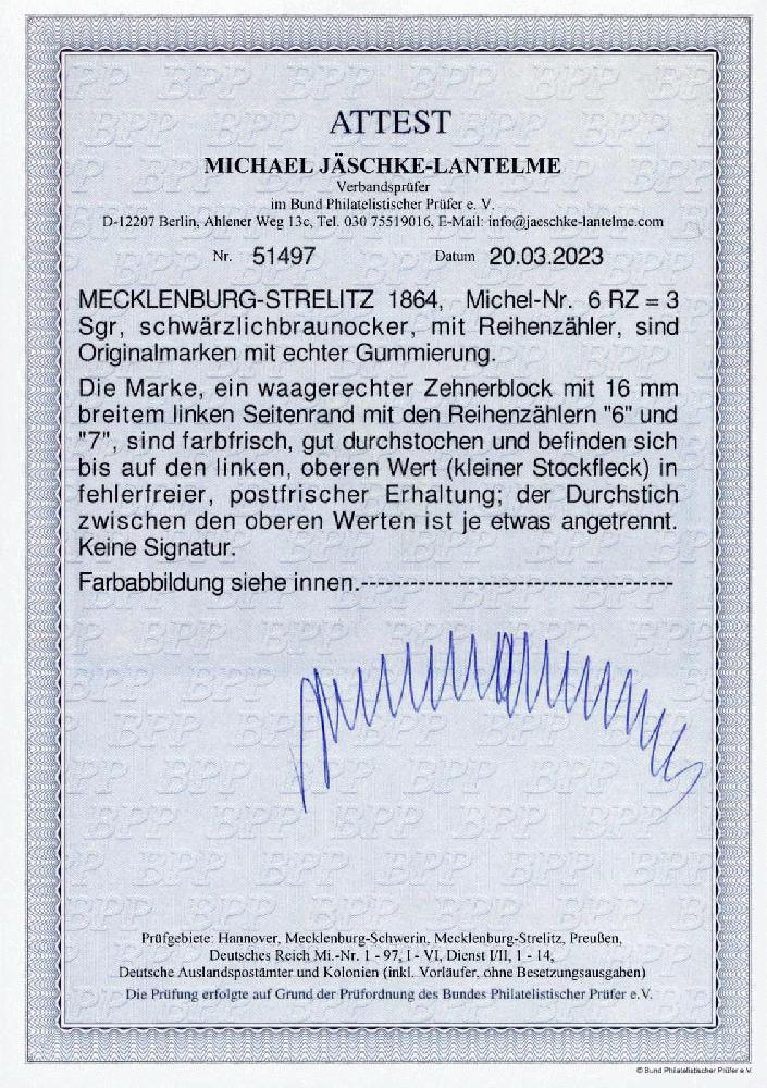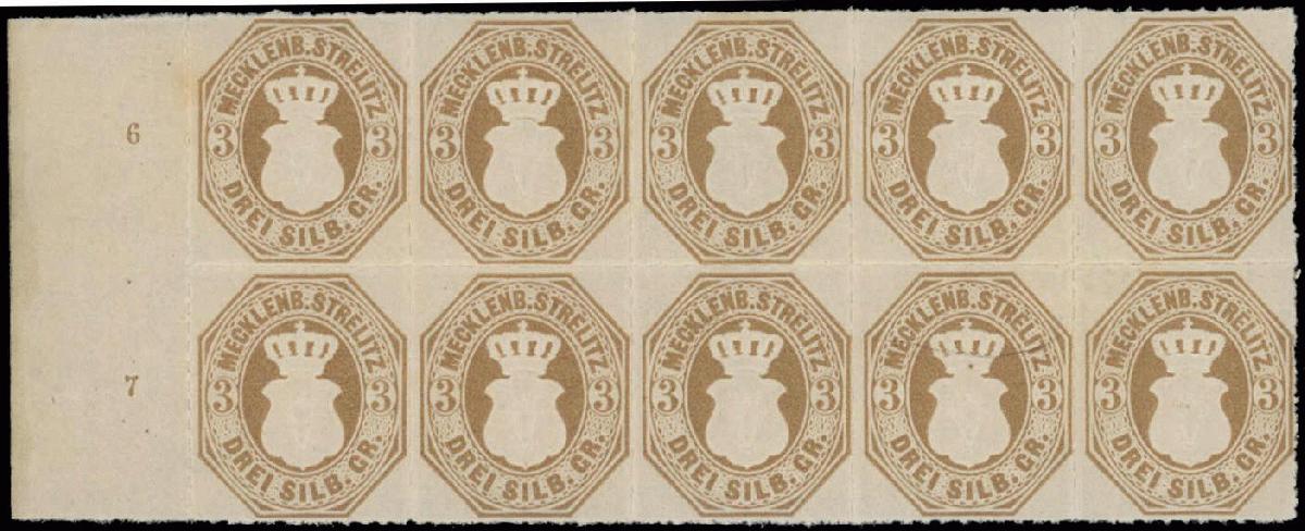 | Zusatzinformationen und Suchstichworte: | 32. Schlegel Auktionshaus Auktion 15. - 19. Mai 2023 Los 5196 Altdeutschland Mecklenburg Strelitz 1864, 3 Sgr. Stierkopf schwärzlichbraunocker, waagerechter Zehnerblock vom 16mm breiten linken Bogenrand mit Reihenzählern "6" und "7", postfrisch, gut durchtstochen, linker oberer Wert kleiner Stockfleck, die anderen einwandfrei, der Durchstich zwischen den oberen Werten ist je etwas angetrennt (auch im Rand neben linker oberer Marke), unsigniert, Fotoattest Jäschke-Lantelme BPP 03/2023 (ME 2.100,-) Zuschlag 400,00 EUR |