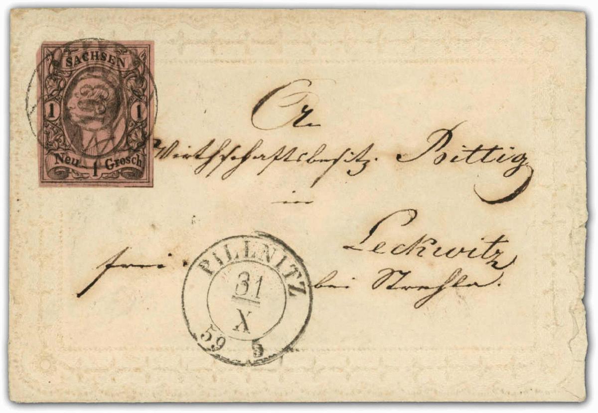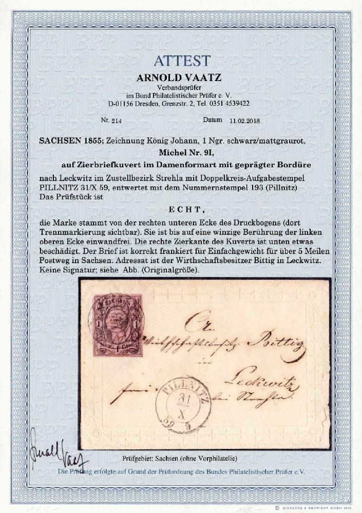 | Zusatzinformationen und Suchstichworte: | 32. Schlegel Auktionshaus Auktion 15. - 19. Mai 2023 Los 5237 Altdeutschland Sachsen 1855, 1 Ngr. König Johann schwarz/mattgraurot, Type I, aus der unteren rechten Bogenecke als Einzelfrankatur auf Zierbriefkuvert im Damenformat mit geprägter Bordüre, links oben winzig berührt sonst vollrandig, einwandfrei, Zierkante des Umschlags unten etwas beschädigt, Fotoattest Vaatz BPP Zuschlag 100,00 EUR |