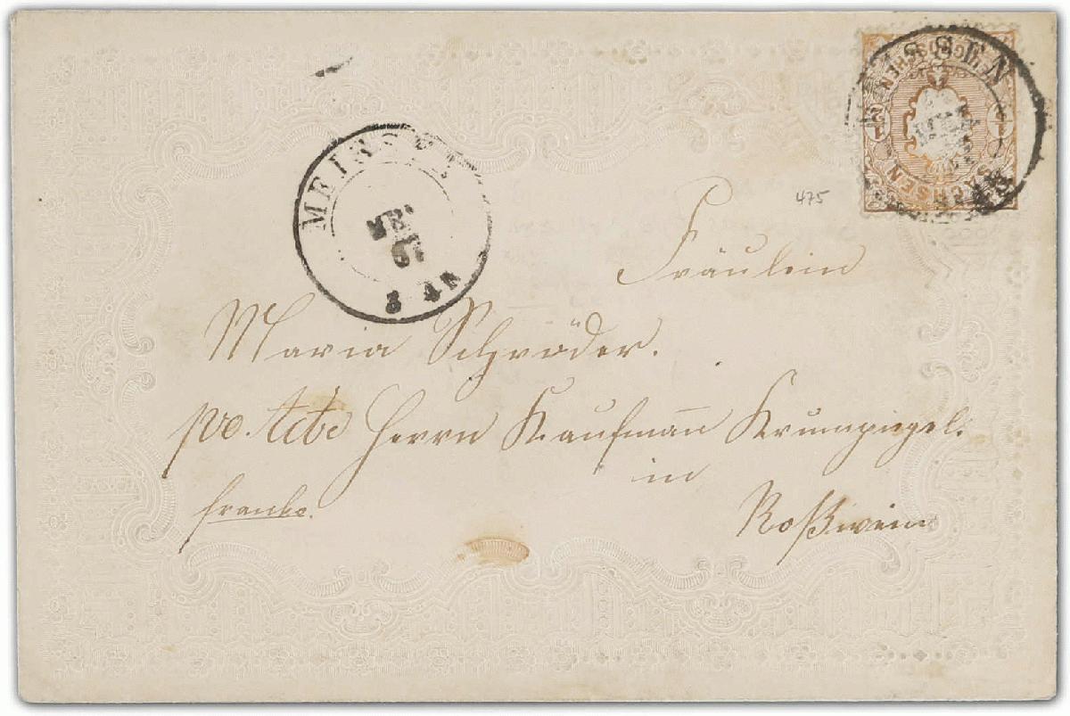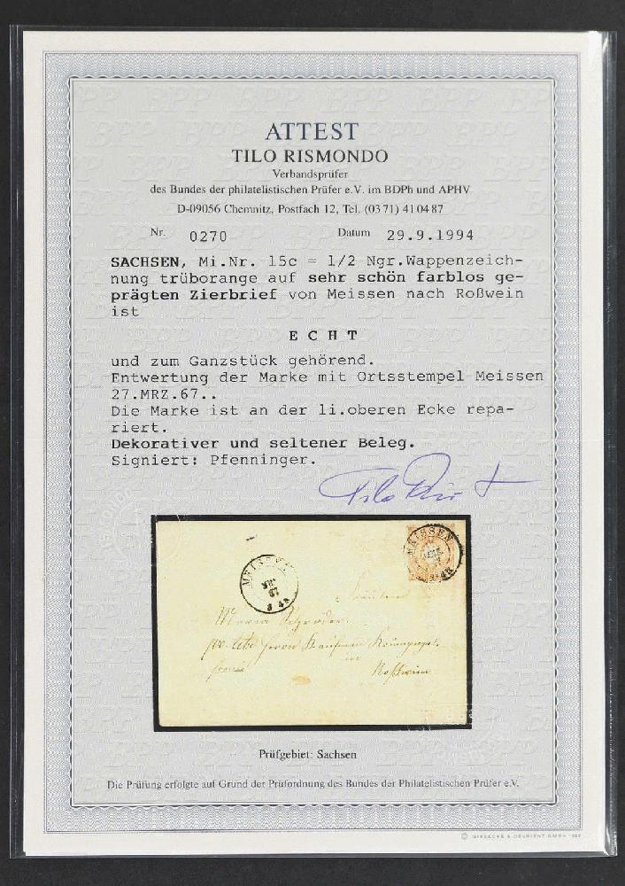 | Zusatzinformationen und Suchstichworte: | 32. Schlegel Auktionshaus Auktion 15. - 19. Mai 2023 Los 5239 Altdeutschland Sachsen 1864/67, ½ Ngr. Wapoen trüborange portogerecht auf farblos geprägtem Zierbrief von Meißen nach Roßwein, Marke links oben repariert, Umschlag etwas Spuren, dennoch dekorativer und seltener Beleg, signiert Pfenninger, Fotoattest Rismondo BPP Ausruf 200,00 EUR |