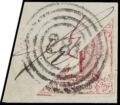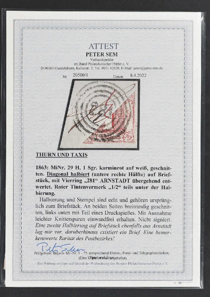 | Zusatzinformationen und Suchstichworte: | 32. Schlegel Auktionshaus Auktion 15. - 19. Mai 2023 Los 5246 Altdeutschland Thurn und Taxis 1863, 1 Sgr. karminrot auf weiß, geschnitten, diagonal halbiert (untere rechte Hälfte) auf Briefstück mit Entwertung durch Vierringnummernstempel "281" von Arnstadt, roter Tintenvermerk "1/2" teils unter der Halbierung, breitrandig geschnitten, links unten mit Teil des Druckspießes, mit Ausnahme leichter Knitterspuren einwandfrei, bemerkenswerte Rarität des Postbezirkes! Fotoattest Sem BPP 04/2022 Ausruf 5.000,00 EUR |
