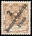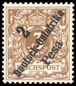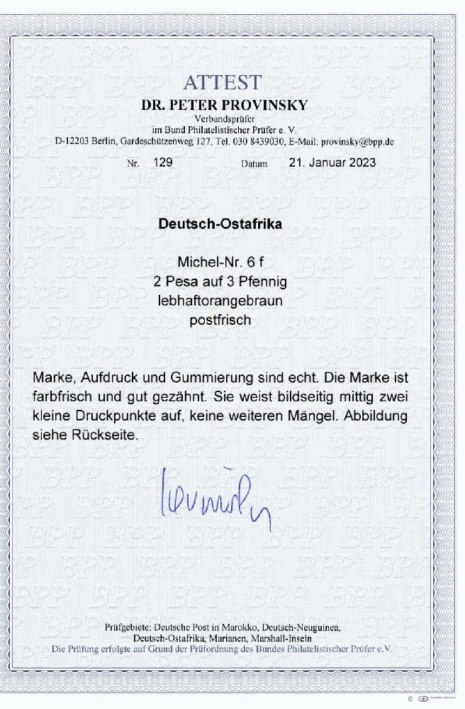 | Zusatzinformationen und Suchstichworte: | 32. Schlegel Auktionshaus Auktion 15. - 19. Mai 2023 Los 6095 Deutsche Kolonien Ostafrika 1895/99, 2 P. auf 3 Pfg. lebhaftorangebraun, postfrisch, bildseitig mittig zwei kleine Druckpunkte, Fotoattest Dr. Provinsky BPP 01/2023 (ME 2.000,-) Ausruf 500,00 EUR |