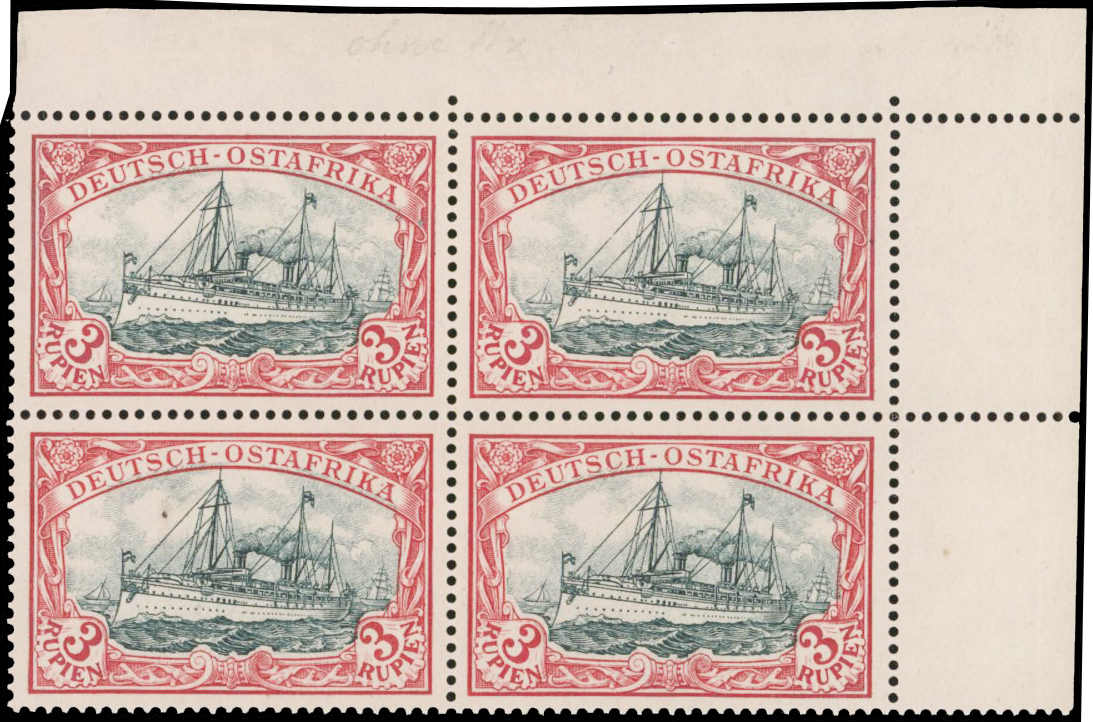 | Zusatzinformationen und Suchstichworte: | 32. Schlegel Auktionshaus Auktion 15. - 19. Mai 2023 Los 6101 Deutsche Kolonien Ostafrika 1901, 3 R. Kaiseryacht dunkelrot/grünschwarz, postfrischer 4er-Block aus der rechten oberen Bogenecke, Falzreste im Oberrand, Fotoattest Bothe BPP und Jäschke-Lantelme BPP "echt in fehlerfreier postfrischer Erhaltung" (ME 1.600,- ++) Zuschlag 720,00 EUR |