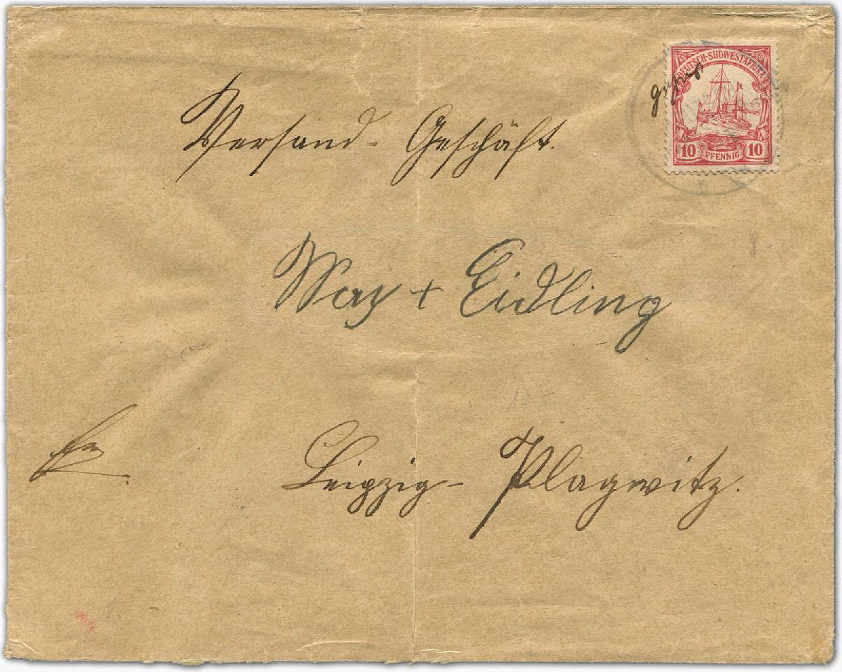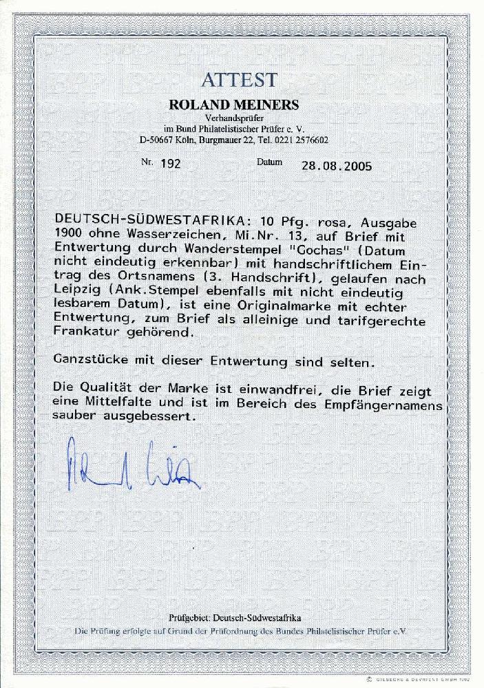| Zusatzinformationen und Suchstichworte: | 32. Schlegel Auktionshaus Auktion 15. - 19. Mai 2023 Los 6296 Deutsche Kolonien Südwestafrika "Gochas" handschriftl. auf Wanderstp. IV., als einzige Entwertung auf Auslandsbrief aus 1904, adressiert nach Leipzig-Plagwitz, rückseitig Ankunftsstp. vom Juli 1904, Brief mit senkr. Mittelbug und sauberer Ausbesserung außerhalb der Frankatur, sonst gute Qualität, Fotoattest Meiners BPP (AG 1.000,-) Ausruf 600,00 EUR |
