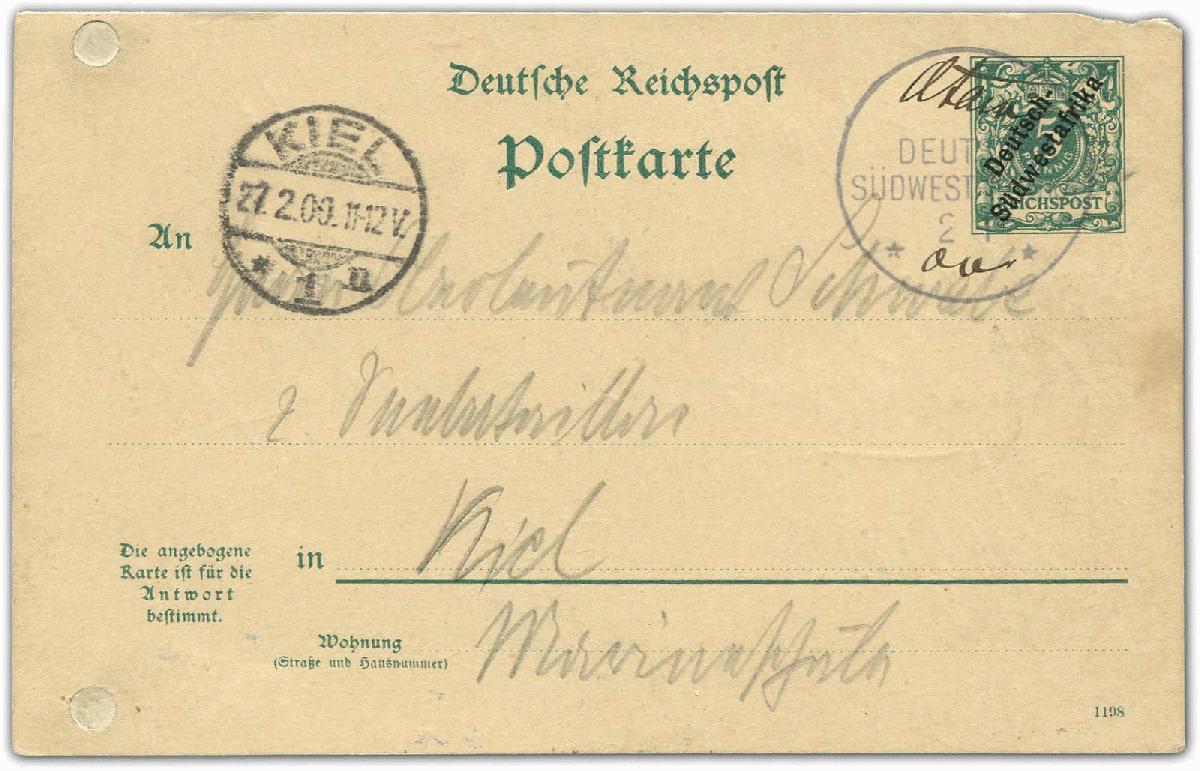 | Zusatzinformationen und Suchstichworte: | 32. Schlegel Auktionshaus Auktion 15. - 19. Mai 2023 Los 6299 Deutsche Kolonien Südwestafrika "Otavi" handschriftlich mit Wanderstp II. vom 22.1.00 und ergänzter Jahreszahl "00", als einzige Entwertung auf einzeln gebrauchtem Frageteil der Doppelkarte P 11, adresssiert nach Kiel, vorderseitig mit Ankunftsstp. vom 27.2.00, links mit geschlossener Aktenlochung, sonst gute Qualität, Fotoattest Jäschke-Lantelme BPP (AG 900,-) Zuschlag 700,00 EUR |