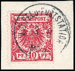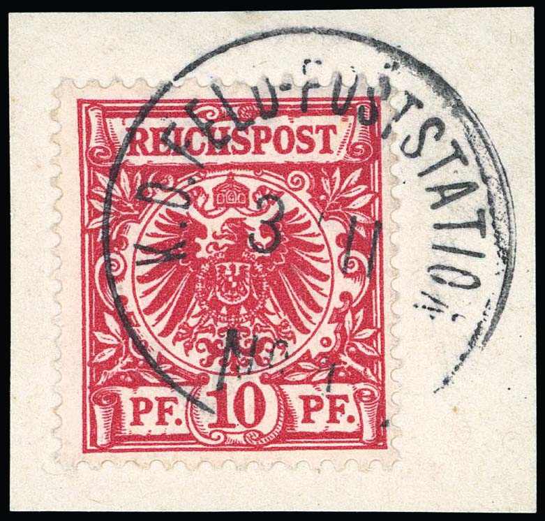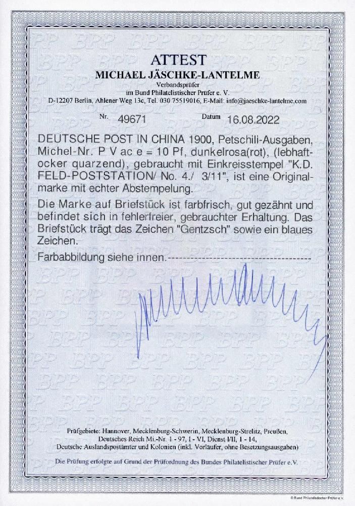 | Zusatzinformationen und Suchstichworte: | 32. Schlegel Auktionshaus Auktion 15. - 19. Mai 2023 Los 6021 Deutsche Auslandspost China, Petschili Ausgaben 1900, 10 Pfg. dunkelrosa(rot), lebhaftocker quarzend, Petschili-Ausgabe, sauber und ideal gestempelt "K.D. FELD-POSTSTATION No. 4. 3/11" sehr dekorativ auf Briefstückchen, völlig tadelloses Exemplar, signiert Gentzsch, Fotoattest Jäschke-Lantelme BPP 08/2022 (ME 4.000,-) Ausruf 1.500,00 EUR |