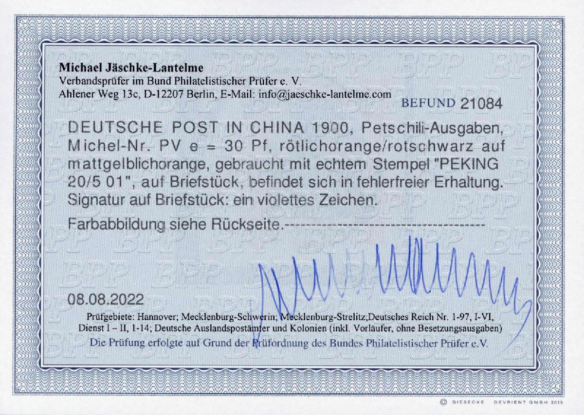 | Prüfgebiet: | Deutsche Auslandspostämter China Petschili-Ausgaben |