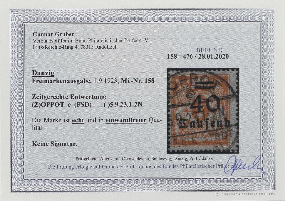 | Zusatzinformationen und Suchstichworte: | 32. Schlegel Auktionshaus Auktion 15. - 19. Mai 2023 Los 6412 Danzig 1923, 40 T. auf 200 M. rötlichorange mit zeitgerechter Entwertung "(Z)OPPOT e (FSD) 5.9.23", einwandfrei, Fotobefund Gruber BPP 01/2020 (ME 280,-) Ausruf 120,00 EUR |