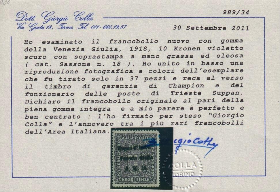 | Zusatzinformationen und Suchstichworte: | 183. Laser Invest Auktion - Live Auktion 22. September 2023 Los 179 Italien Besetzung I. WK Julisch Venetien SOPRASTAMPA A MANO IN CARATTERI DIVERSI. Francobollo da 10 korone con soprastampa "Regno d'Italia Venezia Giulia 3. XI. 18" in inchiostro nero oleoso (n.18), nuovo con gomma in tegra. Esemplare ben centrato con dentellatura in ordine. Corredato da dettagliati certificati Avi e Colla Ausruf 10.500,00 EUR |