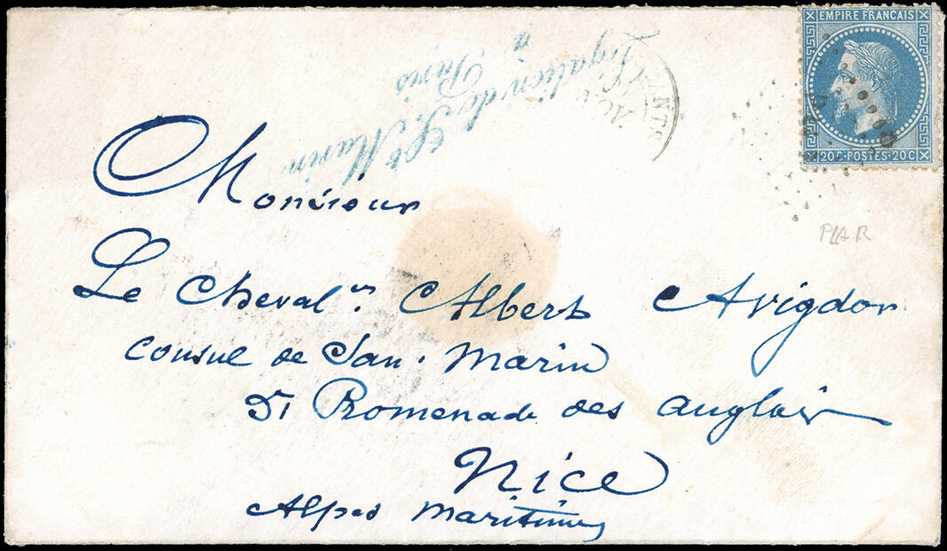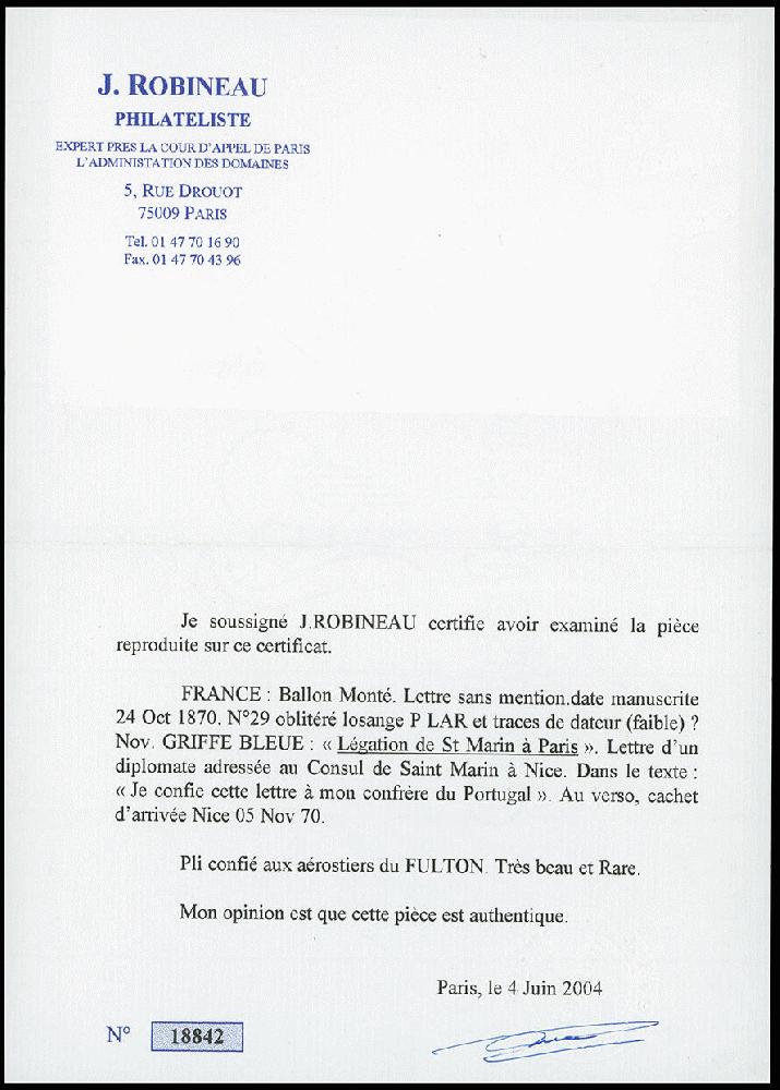 | Zusatzinformationen und Suchstichworte: | Ferrario 29. Auktion 15. Juni 2023 Los 1984 Frankreich FRANCIA POSTA AEREA BALLON MONTE' 1870 - 20 cent. Napoleone laureato (29A), annullato con il bollo a punti P LAR per Nizza 5/11/1870, pli confiè agli aeronauti del Ballon Montè Fulton. Sul fronte il raro corsivo azzurro "Legation de St.Martn". Raro insieme. Cert. Robineau Ausruf 1.000,00 EUR |