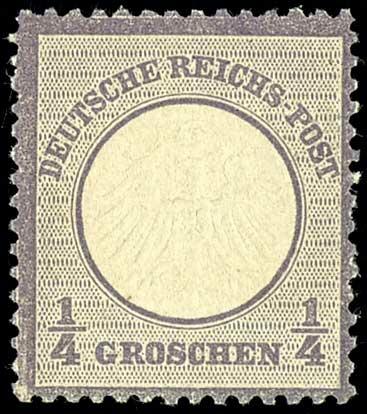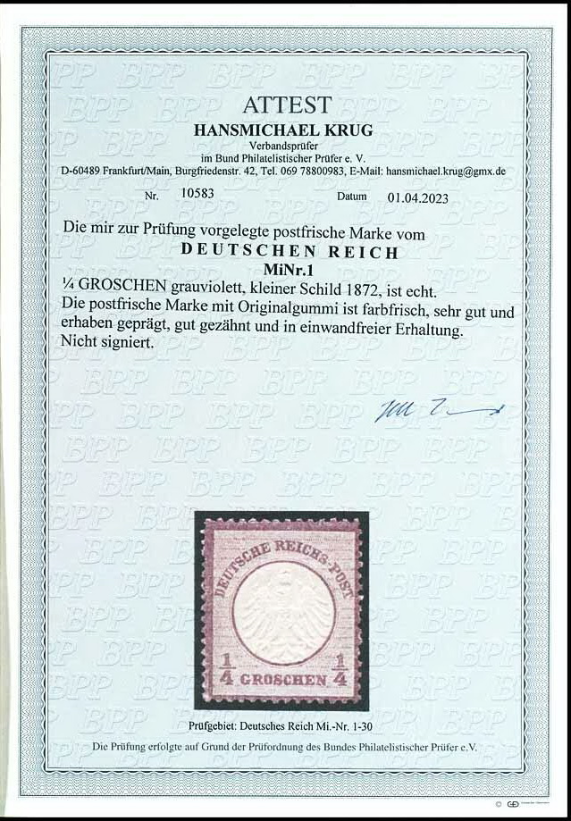 | Zusatzinformationen und Suchstichworte: | Dr. Reinhard Fischer 192. Auktion 19. - 20. Mai 2023 Los 311 Deutsches Reich, 1872 Kleiner Brustschild 1/4 Groschen kleiner Schild, grauviolett, tadellos postfrisch, unsigniert, Fotoattest Hansmichael Krug BPP (2023): "in einwandfreier Erhaltung.", Mi. 1.600.- Zuschlag 1.000,00 EUR |