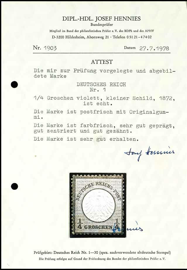 | Zusatzinformationen und Suchstichworte: | Dr. Reinhard Fischer 192. Auktion 19. - 20. Mai 2023 Los 311 Deutsches Reich, 1872 Kleiner Brustschild 1/4 Groschen kleiner Schild, grauviolett, tadellos postfrisch, unsigniert, Fotoattest Hansmichael Krug BPP (2023): "in einwandfreier Erhaltung.", Mi. 1.600.- Zuschlag 1.000,00 EUR |