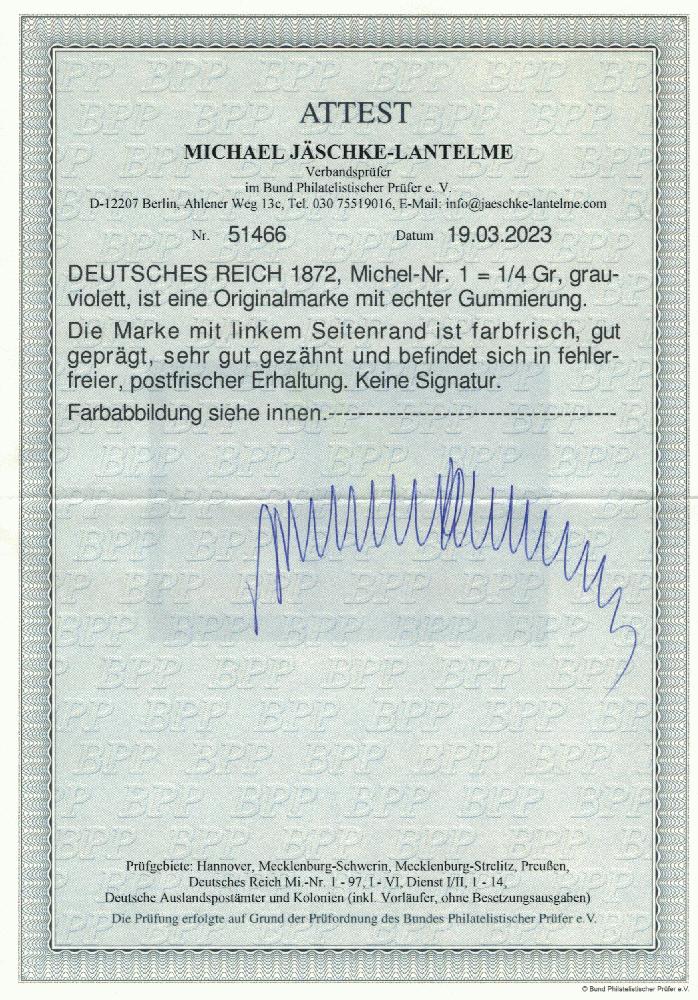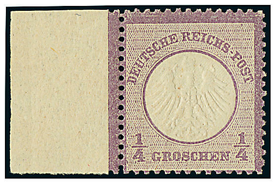| Zusatzinformationen und Suchstichworte: | Dr. Derichs 171. Auktion 18. - 20. August 2023 Los 9145 Deutsches Reich, 1872 Kleiner Brustschild 1/4 Gr. violett "Kleiner Schild", links mit vollständigem Bogenrand (dieser 15,5mm breit), postfrisch in Luxus-Qualität. Ein exquisites Exemplar der ersten Marke des im Deutschen Kaiserreich vereinigten Deutschlands. Unsigniert, neues Fotoattest Jäschke-Lantelme BPP: "in fehlerfreier, postfrischer Erhaltung". (Michel 1.600.-+, dabei kein Aufschlag für den Bogenrand gerechnet) Ausruf 600,00 EUR |
