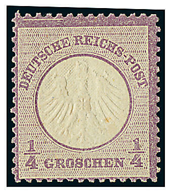 | Zusatzinformationen und Suchstichworte: | Dr. Derichs 171. Auktion 18. - 20. August 2023 Los 9146 Deutsches Reich, 1872 Kleiner Brustschild 1/4 Gr. violett "Kleiner Schild", postfrisches Luxusstück. Ein exquisites Exemplar der ersten Marke des im Deutschen Kaiserreich vereinigten Deutschlands. Unsigniert, neues Fotoattest Jäschke-Lantelme BPP: "in fehlerfreier, postfrischer Erhaltung.". (Michel 1.600.-) Ausruf 600,00 EUR |