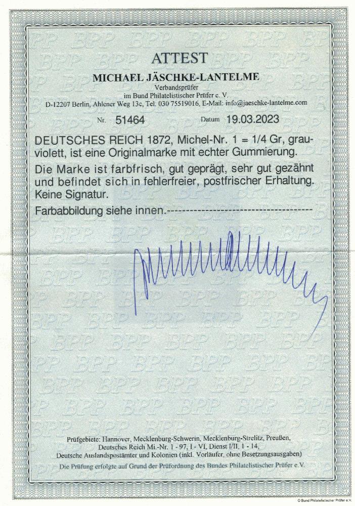| Prüfer: | Jäschke-Lantelme, Michael (BPP (Bund Philatelistischer Prüfer)) |