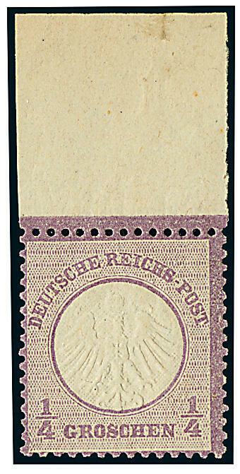 | Zusatzinformationen und Suchstichworte: | Dr. Derichs 171. Auktion 18. - 20. August 2023 Los 9144 Deutsches Reich, 1872 Kleiner Brustschild 1/4 Gr. violett "Kleiner Schild", postfrisches Luxusstück vom Oberrand (dieser 21,5mm breit, nur im weiten Oberrand kleines Stockpünktchen und Randrißchen, ohne Bedeutung). Ein exquisites Exemplar der ersten Marke des im Deutschen Kaiserreich vereinigten Deutschlands, mit dem vollständigen Oberrand besonders selten. Unsigniert, neues Fotoattest Jäschke-Lantelme BPP: "in fehlerfreier, postfrischer Erhaltung". (Michel 1.600.-+, dabei kein Aufschlag für den Oberrand gerechnet) Ausruf 600,00 EUR |