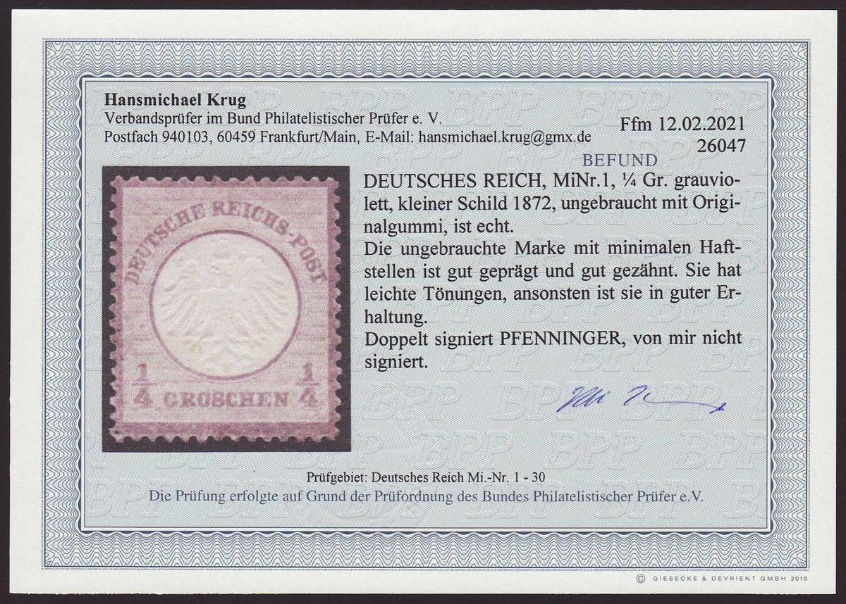 | Zusatzinformationen und Suchstichworte: | Christian E. Geigle Briefmarkenfachhandel Los 0003844760 Deutsches Reich, 1872 Kleiner Brustschild 1872, Kleiner Brustschild, 1/4 Gr. violett, ungebrauchtes Prachtstück, farbfrisch, gut geprägt, gezähnt und zentriert, nur minimale Haftspuren im oberen Bereich bei ansonsten unberührter Originalgummierung, FB Krug "leichte Tönungen, ansonsten gute Erhaltung" Festpreis 119,00 EUR |