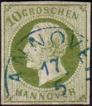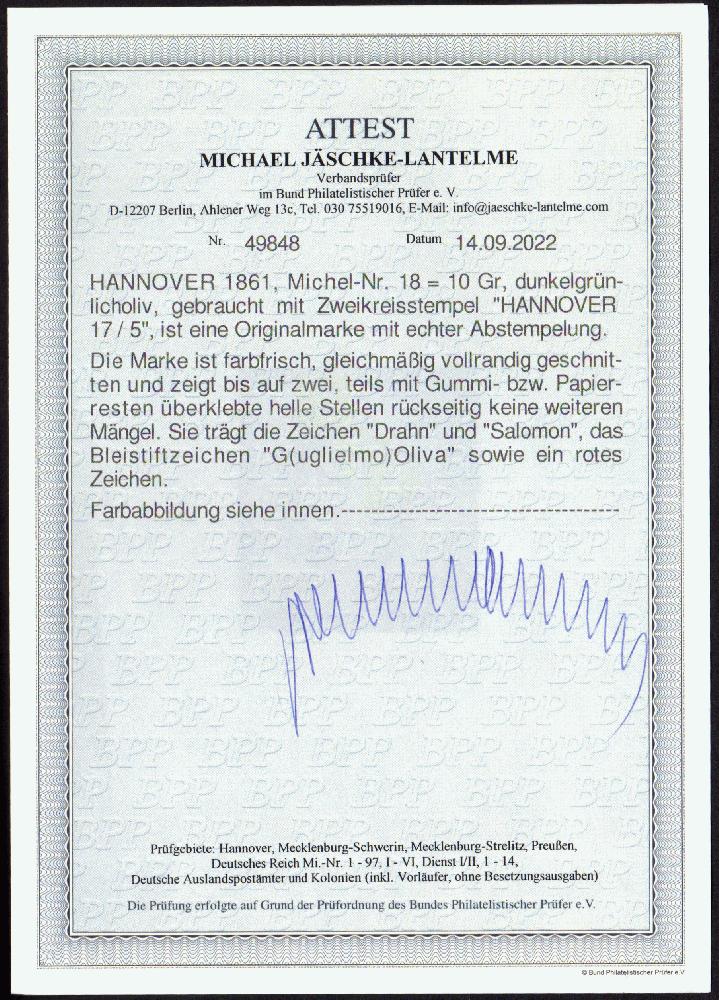 | Zusatzinformationen und Suchstichworte: | 110. Briefmarken Lenz Auktion 21. - 26. April 2023 Los 3030 Altdeutschland Hannover 1861, 10 Gr. dunkelgrünlicholiv, vollrandig, mit blauem K 2 "Hannover 17/5", bis auf 2 helle Stellen keine Mängel, Attest Jäschke-Lantelme, Mi.1.700,- Ausruf 300,00 EUR |