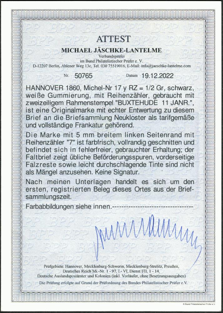 | Zusatzinformationen und Suchstichworte: | 110. Briefmarken Lenz Auktion 21. - 26. April 2023 Los 3028 Altdeutschland Hannover 1860, 1/2 Gr. Freimarke, vollrandige Marke mit linkem Seitenrand und Reihenzähler "7" auf portogerechten Brief mit Ra2 "Buxtehude 11 JANR" an die Briefsammlung Neukloster, es handelt sich um den ersten registrierten Belege dieses Ortes aus der Briefsammlungszeit, übliche Beförderungsspuren, Echt, Attest Jäschke-Lantelme Ausruf 1.000,00 EUR |