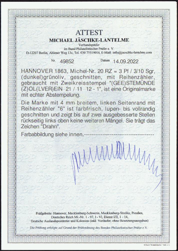 | Zusatzinformationen und Suchstichworte: | 110. Briefmarken Lenz Auktion 21. - 26. April 2023 Los 3035 Altdeutschland Hannover 1863, 3 Pf. dunkelgrünoliv, lupen- bis vollrandig, mit linkem Seitenrand und Reihenzähler "6", mit blauem K 2 "Geestemünde Zollverein 21/11", bis auf 2 ausgebesserte Stellen keine Mängel, Attest Jäschke-Lantelme, Mi.1.200,- Ausruf 220,00 EUR |