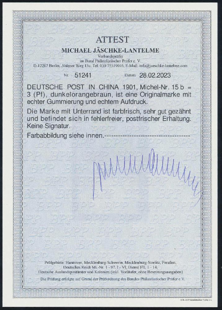 | Zusatzinformationen und Suchstichworte: | HBA 81. Auktion 11. - 13. Mai 2023 Los 1043 (D) Deutsche Auslandspost China 1901, Germania Reichspost mit Aufdruck, 3 Pfg., dunkelorangebraun, tadellos postfrisches Kabinettstück vom Unterrand, auch der Rand postfrisch und ungefaltet, ohne Signaturen und gepr. Jäschke-Lantelme mit neuem Fotoattest, Mi. 480,-- Ausruf 110,00 EUR |