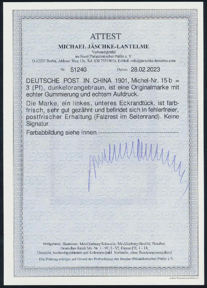 | Zusatzinformationen und Suchstichworte: | HBA 81. Auktion 11. - 13. Mai 2023 Los 1044 (D) Deutsche Auslandspost China 1901, Germania Reichspost mit Aufdruck, 3 Pfg., dunkelorangebraun, tadellos postfrisches Kabinettstück aus der linken, unteren Bogenecke, Falzrest im Seitenrand, sonst auch die Ränder postfrisch und ungefaltet, ohne Signaturen und gepr. Jäschke-Lantelme mit neuem Fotoattest, Mi. 480,-- Zuschlag 280,00 EUR |