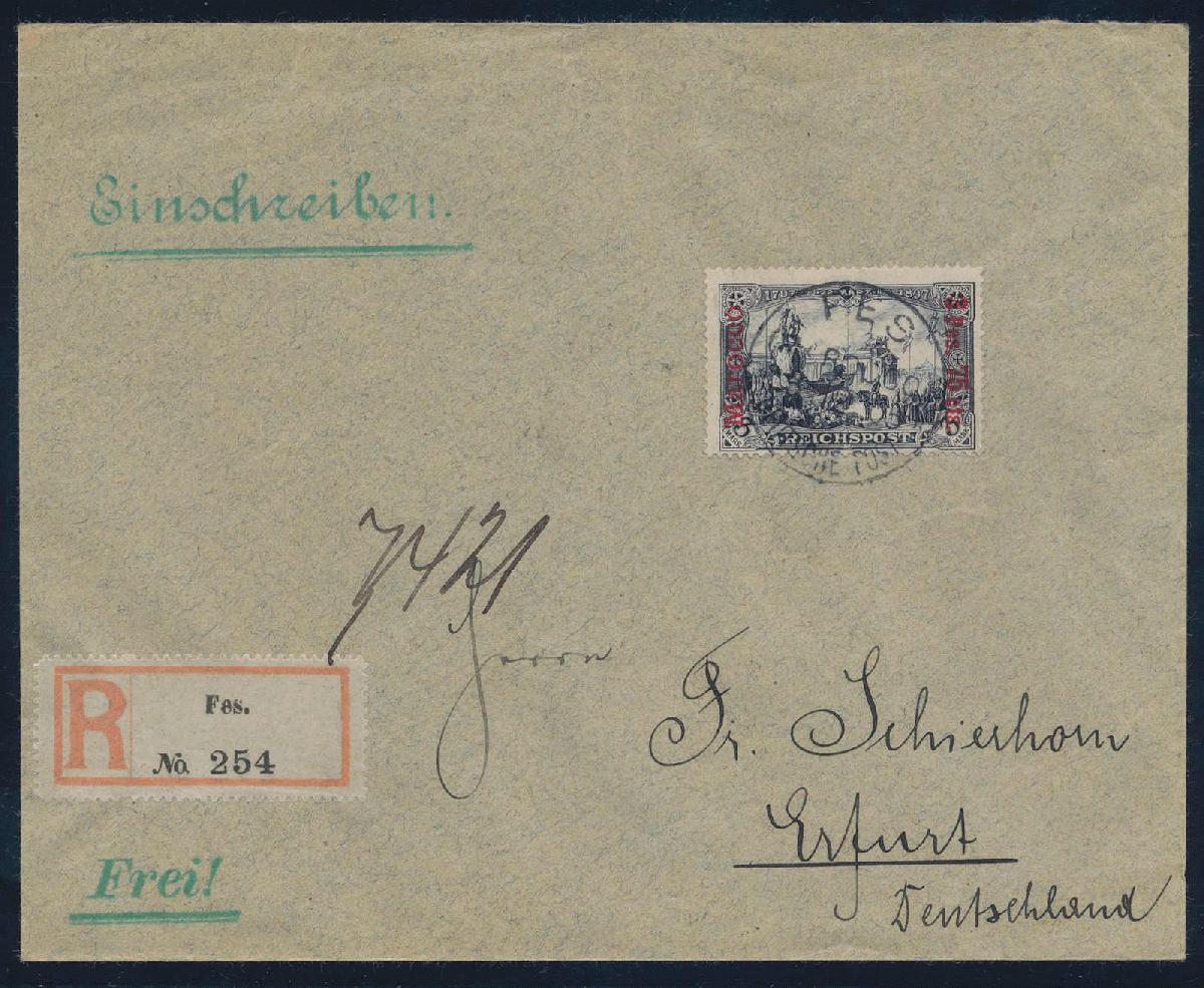 | Zusatzinformationen und Suchstichworte: | HBA 81. Auktion 11. - 13. Mai 2023 Los 1060 (D) Deutsche Auslandspost Marokko 1900, Reichspost mit Aufdruck, 3 Pes. 75 Cts. a. 3 Mk., violettschwarz, Urmarke in Type II, als Einzelfrankatur auf überfrankiertem R-Brief von "FES (MAROCCO) DP 3/12.05", adressiert nach Erfurt mit Ankunftsstempel, tadellose Kabinetterhaltung, gepr. Jäschke-Lantelme mit neuem Fotobefund, Mi.-Briefekatalog 280,-- Zuschlag 180,00 EUR |