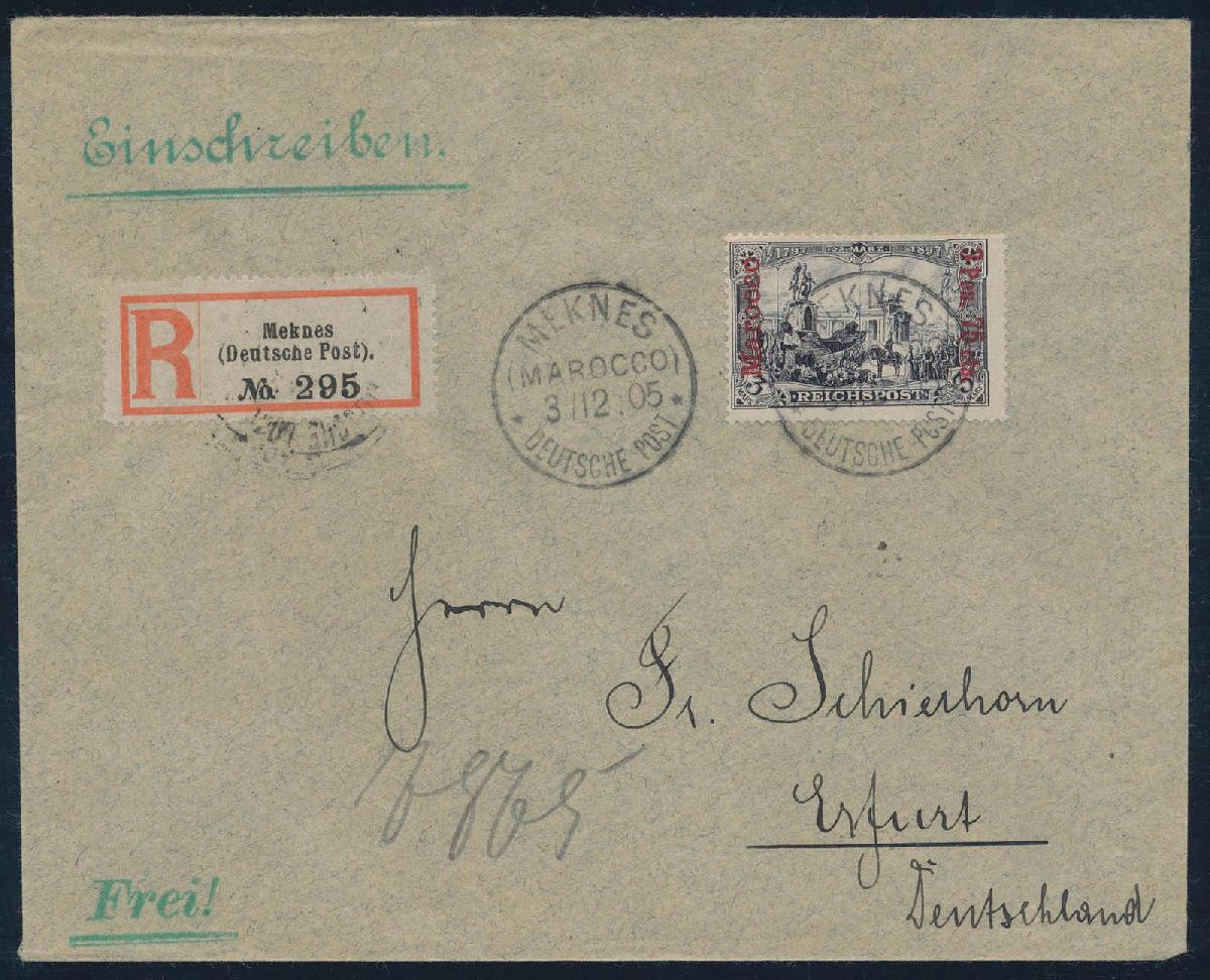 | Zusatzinformationen und Suchstichworte: | HBA 81. Auktion 11. - 13. Mai 2023 Los 1061 (D) Deutsche Auslandspost Marokko 1903, Reichspost mit fettem Aufdruck in Type II, 3 Pes. 75 Cts. a. 3 Mk., violettschwarz, Urmarke in Type II, als Einzelfrankatur auf überfrankiertem R-Brief mit besserem Stempel von "MEKNES (MAROCCO) DP 3/12.05", adressiert nach Erfurt mit Ankunftsstempel, tadellose Kabinetterhaltung, gepr. Jäschke-Lantelme mit neuem Fotoattest, Mi.-Briefekatalog 800,--++ Zuschlag 250,00 EUR |