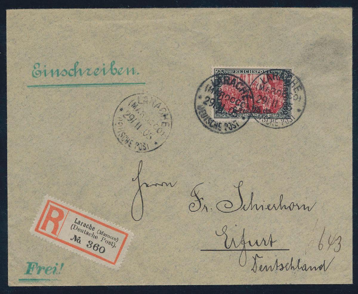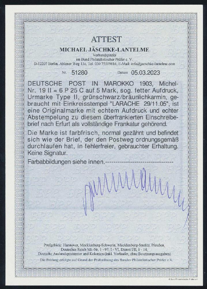| Zusatzinformationen und Suchstichworte: | HBA 81. Auktion 11. - 13. Mai 2023 Los 1062 (D) Deutsche Auslandspost Marokko 1903, Reichspost mit fettem Aufdruck in Type II, 6 Pes. 25 Cts. a. 5 Mk., grünschwarz/bräunlichkarmin, Urmarke in Type II, als Einzelfrankatur auf überfrankiertem R-Brief von "LARACHE (MAROCCO) DP 29/11.05", adressiert nach Erfurt mit Ankunftsstempel, tadellose Kabinetterhaltung, gepr. Jäschke-Lantelme mit neuem Fotoattest, Mi.-Briefekatalog 1100,-- Zuschlag 270,00 EUR |
