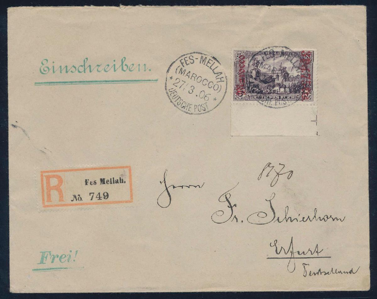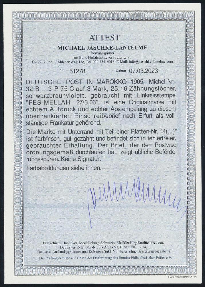 | Zusatzinformationen und Suchstichworte: | HBA 81. Auktion 11. - 13. Mai 2023 Los 1070 (D) Deutsche Auslandspost Marokko 1905, Deutsches Reich ohne Wz., 3 Pes. 75 Cts. a. 3 Mk., schwarzbraunviolett, gezähnt 26:17, Unterrandstück mit Teil einer Plattennummer "4." als Einzelfrankatur auf überfrankiertem R-Brief mit gutem Stempel von "FES-MELLAH (MAROCCO) DP 27/3 06", adressiert nach Erfurt mit Ankunftsstempel, tadellose Kabinetterhaltung, gepr. Jäschke-Lantelme mit neuem Fotoattest, Mi.-Briefekatalog ohne Plattennummer 190,-- + Arge mind. 280,- Zuschlag 230,00 EUR |