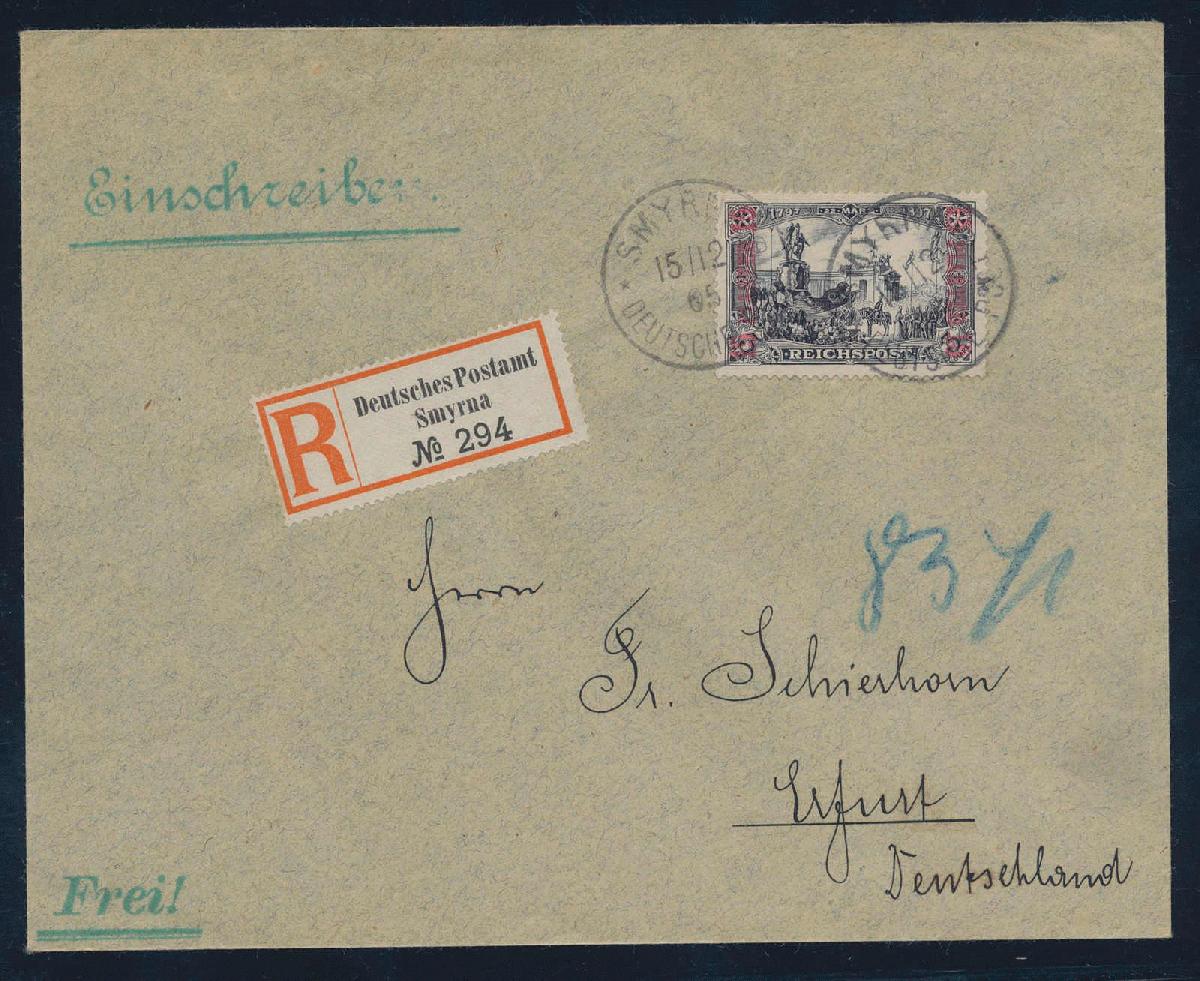 | Zusatzinformationen und Suchstichworte: | HBA 81. Auktion 11. - 13. Mai 2023 Los 1078 (D) Deutsche Auslandspost Türkei 1900, Reichspost mit Aufdruck, 15 Piaster a. 3 Mk., violettschwarz, Urmarke Type I, als Einzelfrankatur auf überfrankiertem R-Brief von "SMYRNA DP 15/12 05", adressiert nach Erfurt mit Ankunftsstempel, tadellose Kabinetterhaltung, gepr. Jäschke-Lantelme mit neuem Fotobefund, Mi.-Briefekatalog 380,-- Zuschlag 95,00 EUR |
