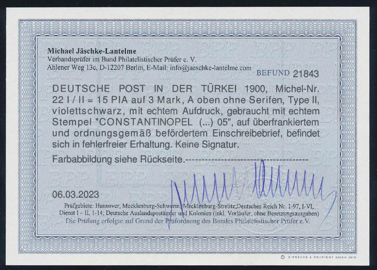 | Prüfer: | Jäschke-Lantelme, Michael (BPP (Bund Philatelistischer Prüfer)) |