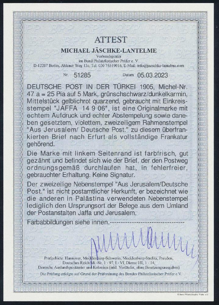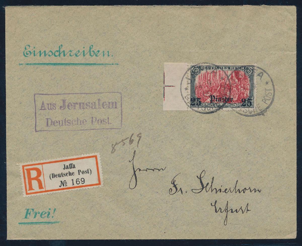 | Zusatzinformationen und Suchstichworte: | HBA 81. Auktion 11. - 13. Mai 2023 Los 1083 (D) Deutsche Auslandspost Türkei 1905, Deutsches Reich mit Wz., 25 Piaster a. 5 Mk., grünschwarz/dunkelkarmin, gelblichrot quarzend, Seitenrandstück als überfrankierte Einzelfrankatur auf schönem R-Brief von "JAFFA DP 14 9 06", adressiert nach Erfurt mit Ankunftsstempel, als Nebenstempel der blauviolette zweizeilige Rahmenstempel "AUS JERUSALEM DEUTSCHE POST", tadellose Kabinetterhaltung, gepr. Jäschke-Lantelme mit neuem Fotoattest, Mi.-Briefekatalog 400,-- + Arge 150,-- Zuschlag 220,00 EUR |