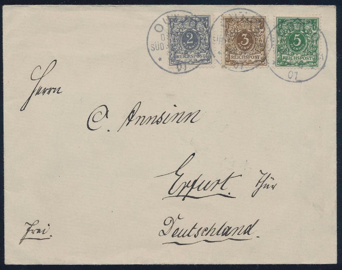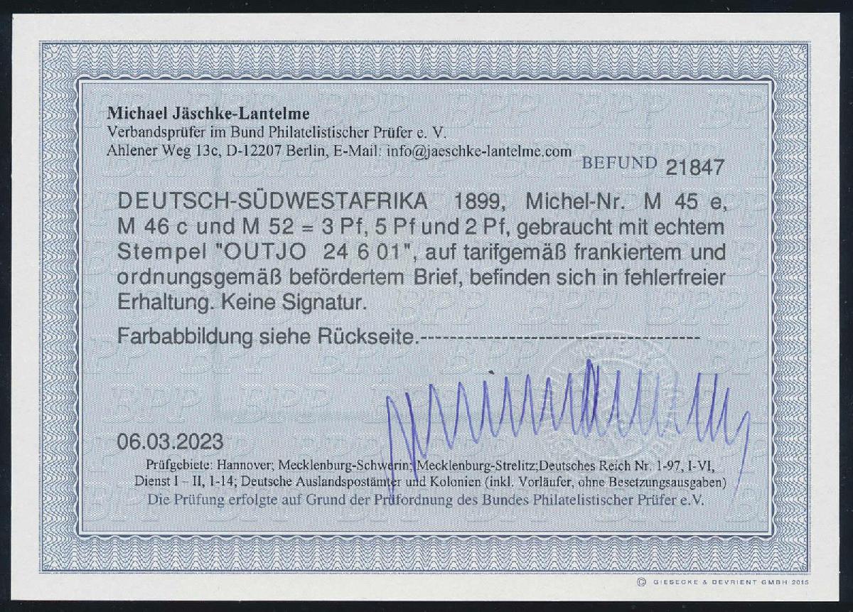 | Zusatzinformationen und Suchstichworte: | HBA 81. Auktion 11. - 13. Mai 2023 Los 1100 (D) Deutsche Kolonien Deutsch Südwestafrika Mitläufer 1901, Krone/Adler, 3 Pfg., dunkelockerbraun, in Farbfrankatur mit 5 Pfg., opalgrün und 2 Pfg., grau, als Mitläufer gebraucht auf portogerechtem Brief von "OUTJO DSWA 24 6 01", adressiert nach Erfurt mit Ankunftsstempel, jede Marke einzeln sauber entwertet, tadellose Kabinetterhaltung, gepr. Jäschke-Lantelme mit neuem Fotobefund, Mi./Dr. Steuer ohne Bewertung der 2 Pfg. 470,-- Zuschlag 180,00 EUR |