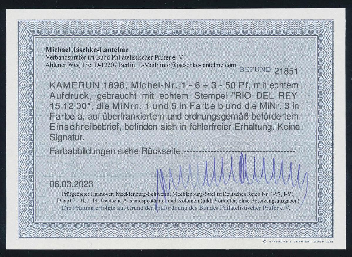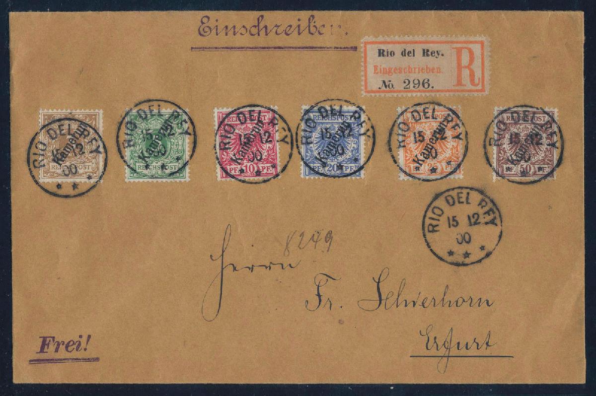 | Zusatzinformationen und Suchstichworte: | HBA 81. Auktion 11. - 13. Mai 2023 Los 1121 (D) Deutsche Kolonien Kamerun 1898, Krone/Adler mit Aufdruck, 6 W. kpl., mit 1b, 3a und 5b, auf wunderschönem, überfrankiertem R-Satzbrief von "RIO DEL REY 15 12 00", adressiert nach Erfurt mit Ankunftsstempel, tadellose Kabinetterhaltung, gepr. Jäschke-Lantelme mit neuem Fotobefund, Mi. lose gest. 190,-- Zuschlag 180,00 EUR |