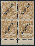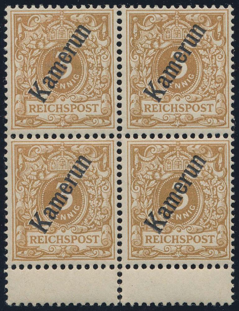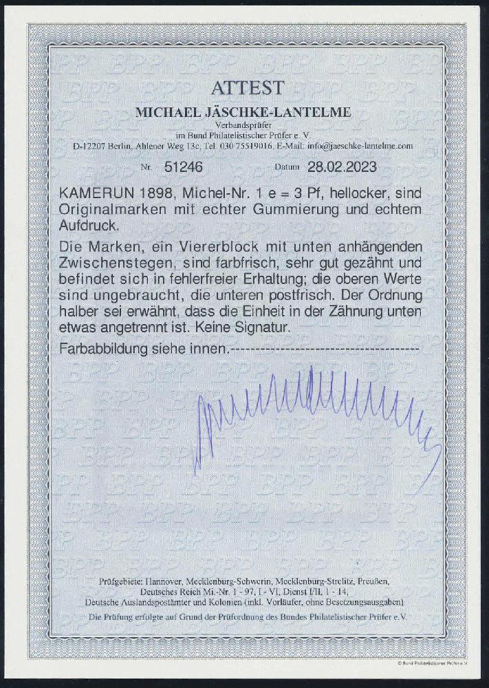| Zusatzinformationen und Suchstichworte: | HBA 81. Auktion 11. - 13. Mai 2023 Los 1123 (D) Deutsche Kolonien Kamerun 1898, Krone/Adler mit Aufdruck, 3 Pfg., hellocker, Viererblock mit unten anhängenden Zwischenstegen, die oberen Marken sind sauber ungebraucht, die unteren sind postfrisch, tadellose Kabinetterhaltung, die Zähnung unten ist mittig etwas angetrennt, ohne Signaturen und gepr. Jäschke-Lantelme mit neuem Fotoattest, Mi. 1400,-- Zuschlag 410,00 EUR |