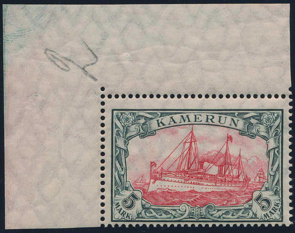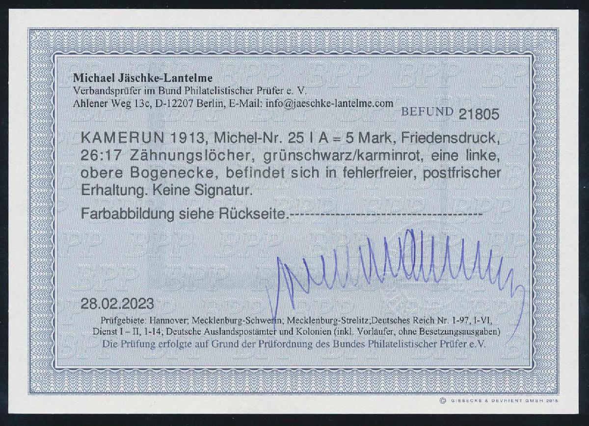 | Zusatzinformationen und Suchstichworte: | HBA 81. Auktion 11. - 13. Mai 2023 Los 1125 (D) Deutsche Kolonien Kamerun 1913, Schiffszeichnung mit Wz., Friedensdruck, gez. 26:17, 5 Mk., grünschwarz/karminrot, tadellos postfrisches Kabinettstück aus der linken, oberen Bogenecke, auch die Ränder postfrisch und ungefaltet, ohne Signaturen und gepr. Jäschke-Lantelme mit neuem Fotobefund, Mi. 400,-- Zuschlag 430,00 EUR |