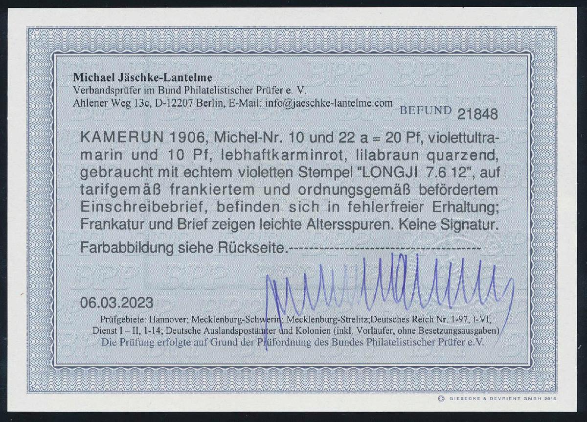 | Zusatzinformationen und Suchstichworte: | HBA 81. Auktion 11. - 13. Mai 2023 Los 1126 (D) Deutsche Kolonien Kamerun LONGJI KAMERUN 7.6 12, violetter Abschlag, 2mal voll auf portogerechtem Bedarf-R-Brief mit Schiffszeichnung 20 und 10 Pfg., adressiert nach Berlin mit Ankunftsstempel, tadellose Kabinetterhaltung, gepr. Jäschke-Lantelme mit neuem Fotobefund Zuschlag 110,00 EUR |