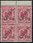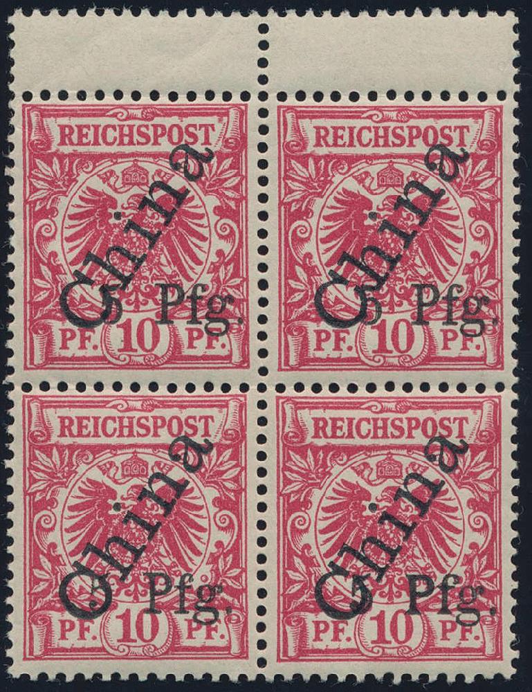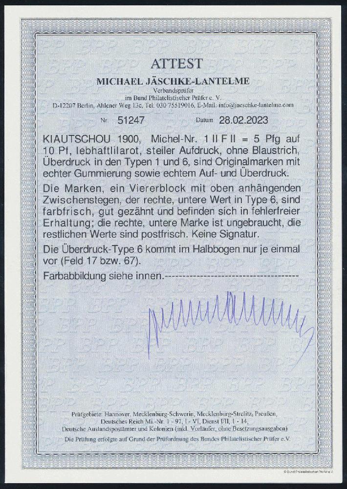 | Zusatzinformationen und Suchstichworte: | HBA 81. Auktion 11. - 13. Mai 2023 Los 1134 (D) Deutsche Kolonien Kiautschou 1900, 1. Tsingtau-Ausgabe, 5 Pfg. a. 10 Pfg., China steil, Viererblock mit oben anhängenden Zwischenstegen, Aufdruck Type 1 und einmal Type 6 (sehr selten), alle Marken mit Abart "ohne Blaustrich", die rechte, untere Marke (Type 6) ist sauber ungebraucht, sonst alle Marken postfrisch, tadellose Kabinetterhaltung, sehr seltene Abart, die echt und ohne Manipulation kaum vorkommt, ohne Signaturen und gepr. Jäschke-Lantelme mit neuem Fotoattest, Mi. ohne Bewertung der Type 6 2250,-- Zuschlag 700,00 EUR |