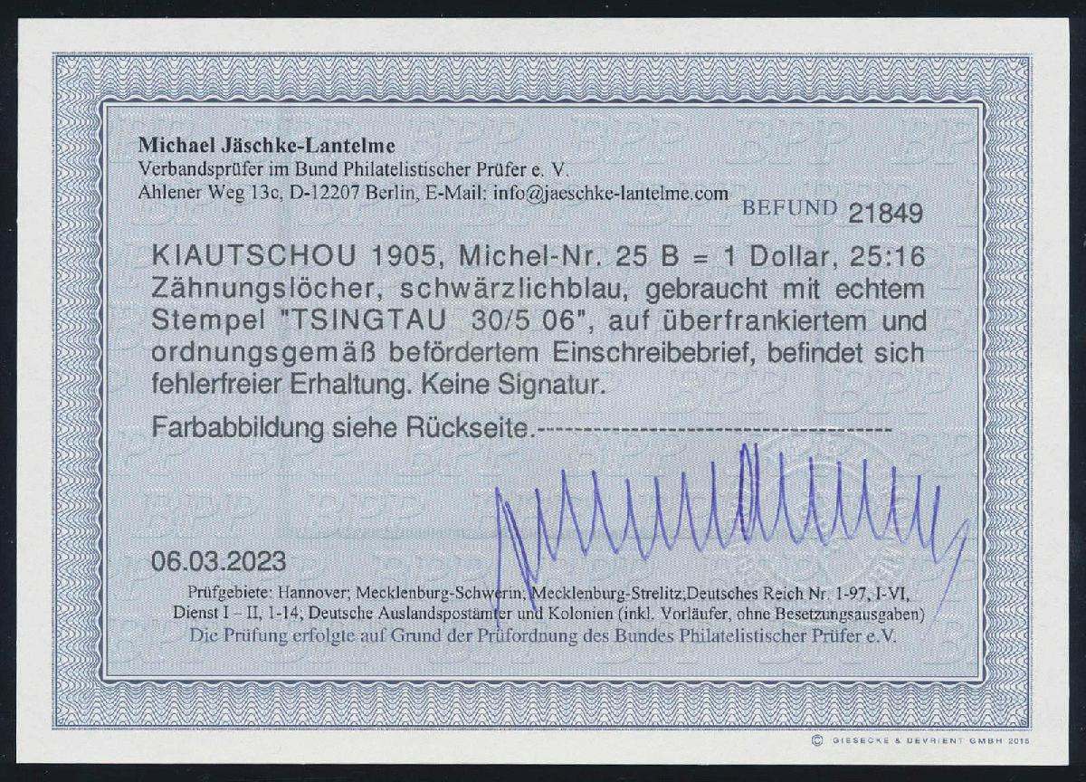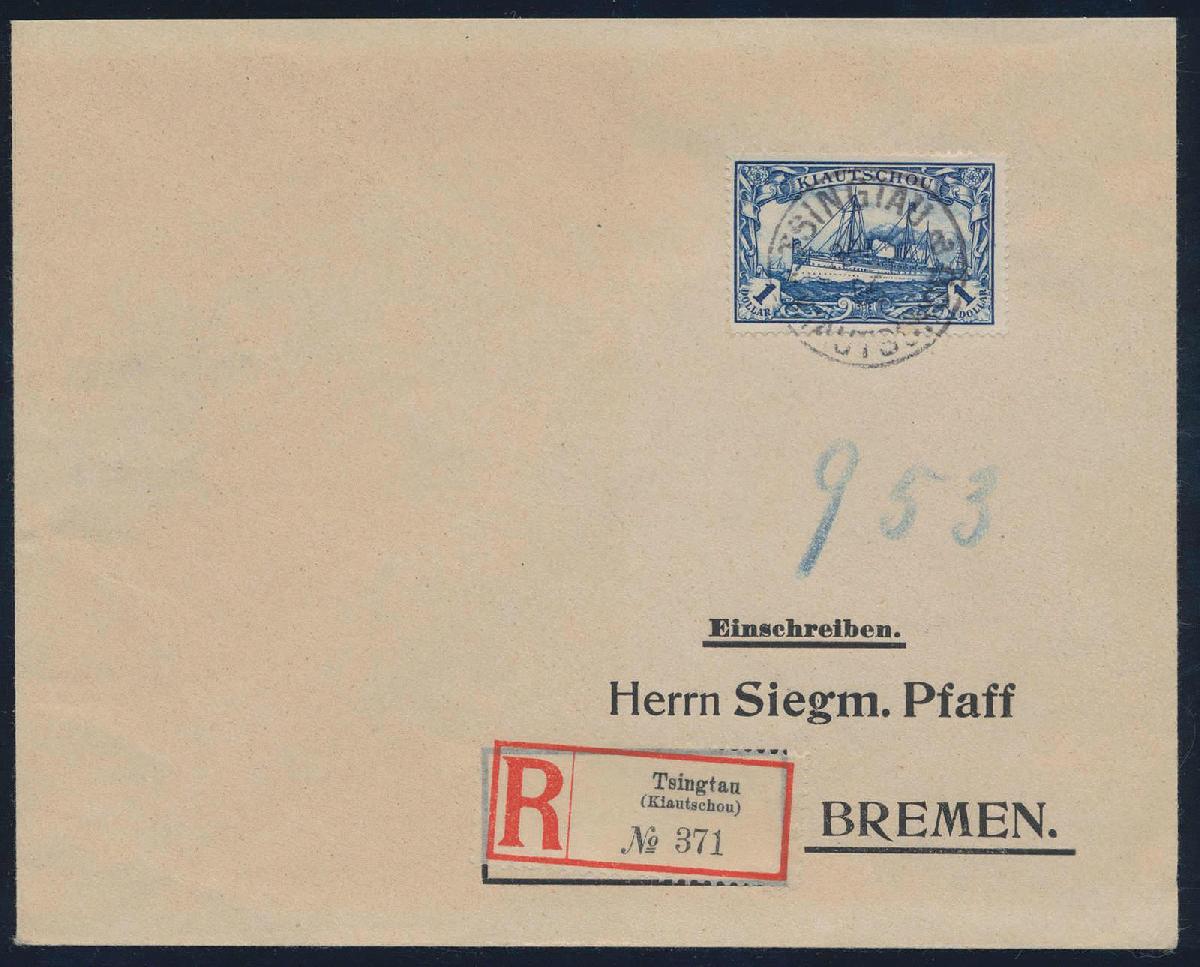 | Zusatzinformationen und Suchstichworte: | HBA 81. Auktion 11. - 13. Mai 2023 Los 1136 (D) Deutsche Kolonien Kiautschou 1905, Schiffszeichnung ohne Wz., 1 $, schwärzlichblau, gezähnt 25:16, als Einzelfrankatur auf überfrankiertem R-Brief von "TSINGTAU KIAUTSCHOU a 30/5 06", adressiert nach Bremen mit Ankunftsstempel, tadellose Kabinetterhaltung, gepr. Jäschke-Lantelme mit neuem Fotobefund, Mi.-Briefekatalog 280,-- Zuschlag 95,00 EUR |