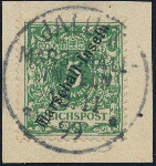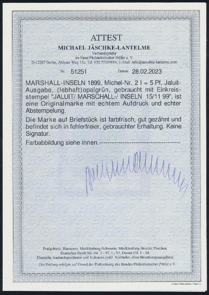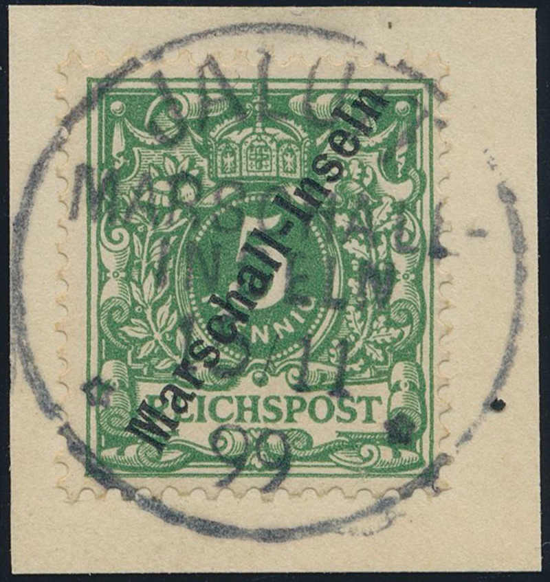 | Zusatzinformationen und Suchstichworte: | HBA 81. Auktion 11. - 13. Mai 2023 Los 1148 (D) Deutsche Kolonien Marshall Inseln 1899, Jaluit-Ausgabe, 5 Pfg., (lebhaft)opalgrün, auf ideal gestempeltem Kabinettbriefstück mit 1. Stempel "JALUIT MARSCHALL-INSELN 15/11 99", ohne Signaturen und gepr. Jäschke-Lantelme mit neuem Fotoattest, Mi. 550,-- Zuschlag 190,00 EUR |