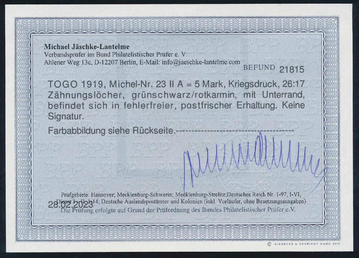 | Prüfer: | Jäschke-Lantelme, Michael (BPP (Bund Philatelistischer Prüfer)) |