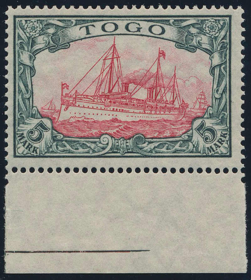 | Zusatzinformationen und Suchstichworte: | HBA 81. Auktion 11. - 13. Mai 2023 Los 1154 (D) Deutsche Kolonien Togo 1919, Schiffszeichnung mit Wz., 5 Mk., grünschwarz/rotkarmin, Kriegsdruck, gezähnt 26:17, tadellos postfrisches Kabinettstück vom Unterrand, auch der Rand postfrisch und ungefaltet, ohne Signaturen und gepr. Jäschke-Lantelme mit neuem Fotobefund, Mi. 380,-- Zuschlag 150,00 EUR |