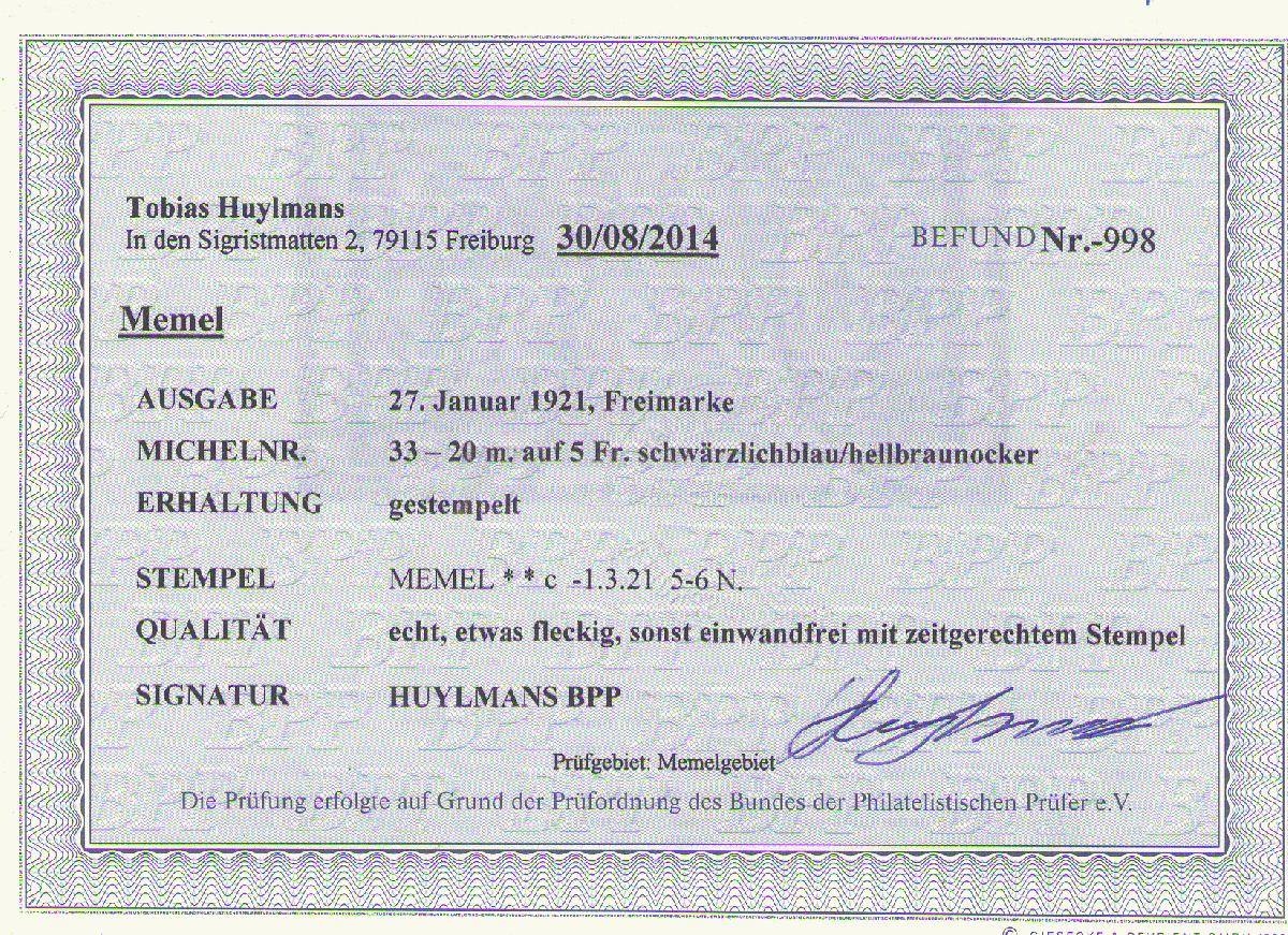 | Prüfer: | Huylmans, Tobias (BPP (Bund Philatelistischer Prüfer)) |